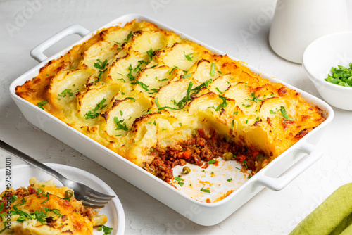 English Shepherd's pie, or cottage pie, or French version hachis Parmentier. Cooked minced beef meat with vegetables topped with mashed potato and baked.