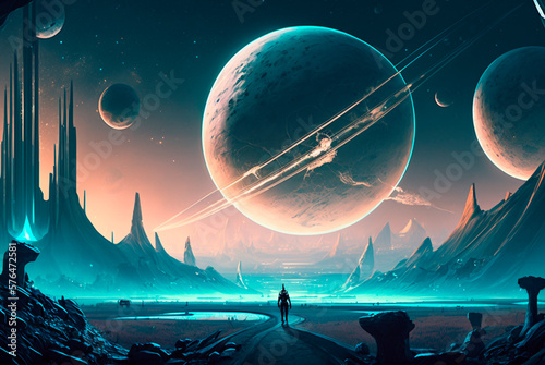 An otherworldly terrain, showcasing the vistas of a celestial planet situated in the depths of space, generative AI