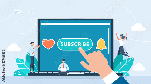 The man clicks on the Subscribe button. Set icon button like, subscribe, bell notification. Buttons for app. Tiny people subscribe to the channel. Notification icons. Flat style. Illustration.