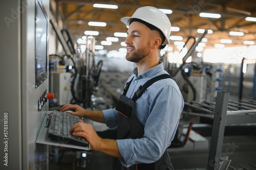 Factory for aluminum and PVC windows and doors production. Manual worker assembling PVC windows and doors.