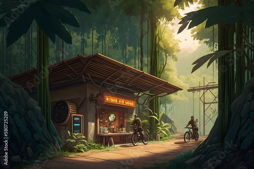 Charging station situated in the middle of a jungle. electric bike and car charging at station with people, Generative AI