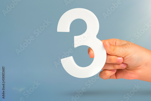 Number three in hand. Hand holding white number 3 on blue background with copy space. Concept with number three. 3 percent, birthday 3 years, third grade, triple