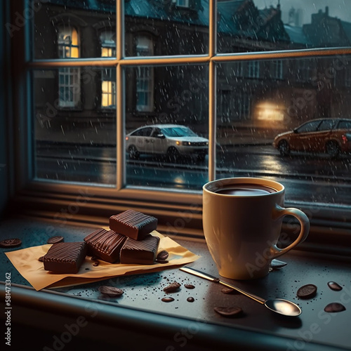 rainy Background, rany weather Background , dark windows, Headset,coffee cup on the table and table is behind the window 4K, United Kingdom, a piece chocolate