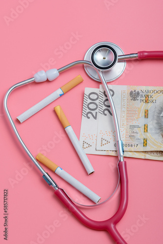 Palenie papierosów a zdrowie - papierosy obok pieniędzy i medycznego stetoskopu