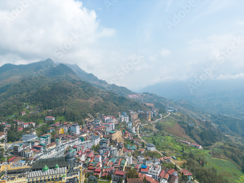 Aerial view of landscape at the hill town in Sapa city, Lao Cai Province, Vietnam in Asia with the sunny light and sunset, mountain view in the clouds