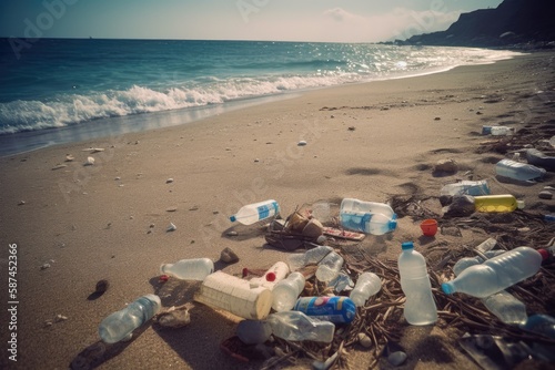 A striking photo of a polluted beach, with the emphasis on the overwhelming amount of plastic waste that is polluting our oceans.