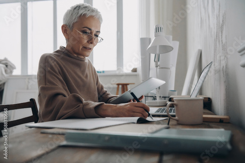 Concentrated senior woman making notes in pad while sitting at the desk in office