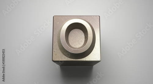 Letra metálica O de imprenta en alto relieve sobre fondo blanco.