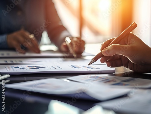 Buchhalter arbeiten an Bilanz zur Analyse von Problemen und finden Lösungen zur Weiterentwicklung von Unternehmensorganisation und Aktienmarktsystem, Generative AI.