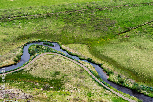 krajobraz Islandii z rzeczką i zielenią