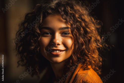 A young woman with a natural, effortless beauty. Her hair is tousled and carefree, and her skin is unadorned, yet still radiates a captivating glow. Generative AI