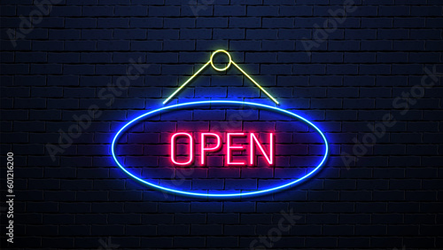 The neon sign is open against the background of a brick wall.