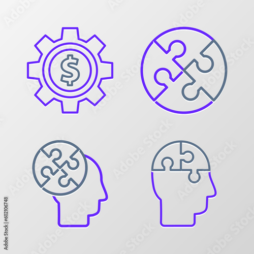 Set line Human head puzzles strategy, Piece of and Gear with dollar symbol icon. Vector