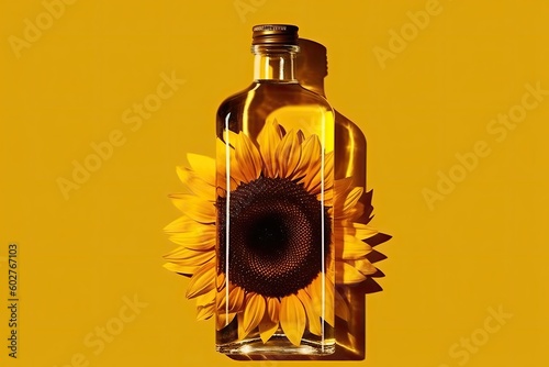 bottle of sunflower oil on a bright yellow background Generative AI