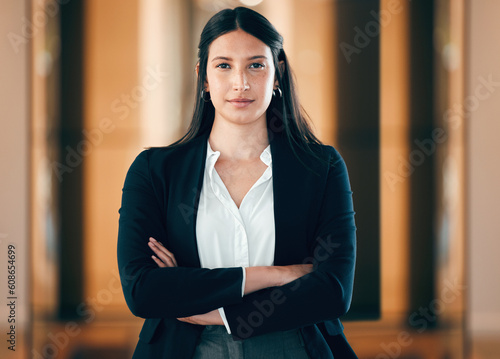 Business, woman and arms in a serious portrait at the office for career as entrepreneur in company. Female professional, focus and face with arm as leader in a workplace for job with employee.