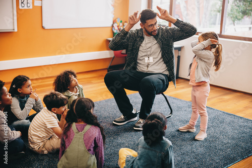 Male educator in a primary school class. Teacher shows a little girl how to do heads and shoulders