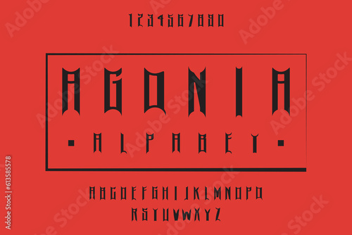 Agonia Gothic Abstract Alphabet English Letters with Horns Typeface for Design t-shirt, posters, flyers and many more. Uppercase typography lettering