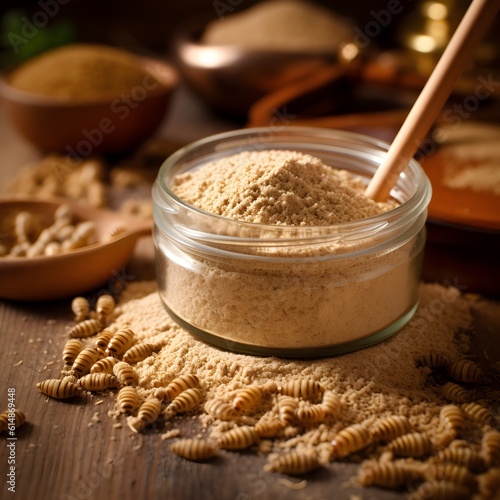 Snack insects. Tasty mealworm larvae as food, mealworm flour for sale in glass jar. Ai generated