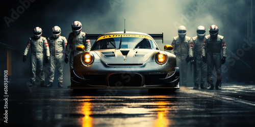 During a pitstop in a car race, a professional pit crew is prepared for action as their team's race car enters the pit lane, demonstrating the pinnacle of collaboration.