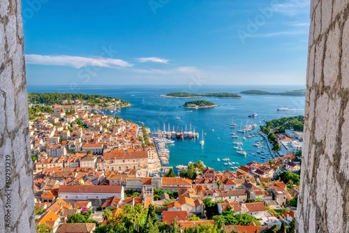 The picturesque Dalmatian coast resort town of Hvar, Croatia, viewed from the 13th century fortress on the hill above.