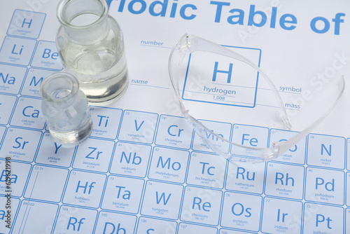 Flasks and protective glasses on periodic table of chemical elements, closeup