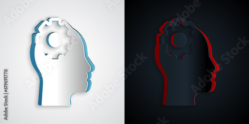 Paper cut Human head with gear inside icon isolated on grey and black background. Artificial intelligence. Thinking brain. Symbol work of brain. Paper art style. Vector