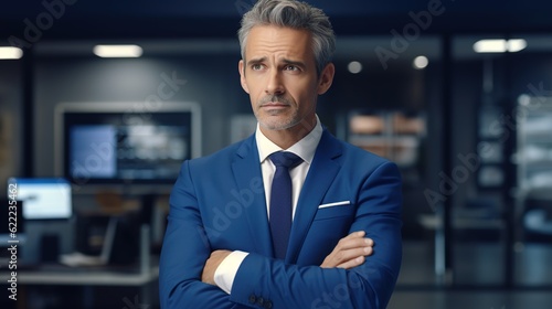 Serious confident middle aged businessman, thoughtful doubtful company ceo executive wearing blue suit standing in office holding hand in chin looking at camera thinking, generative ai