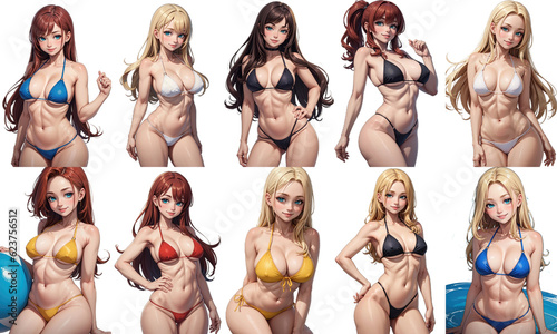 Set of Cute sexy woman in bikini swimsuit. Collection of png illustrations, isolated transparent background anime style cartoon collage