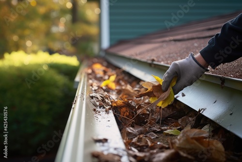 A person is removing dirt, debris, and leaves from a blocked roof gutter in order to avoid water damage and allow rainwater to flow smoothly.