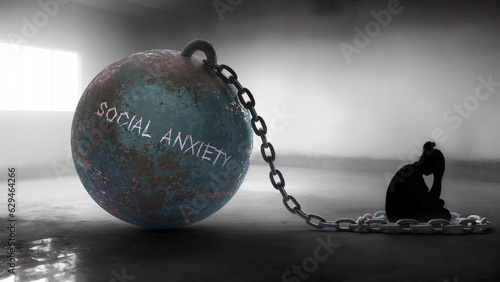 Social anxiety - a metaphorical view of a woman struggle with social anxiety. Trapped alone and chained to a burden of Social anxiety. Constant and strenuous fight.,3d illustration
