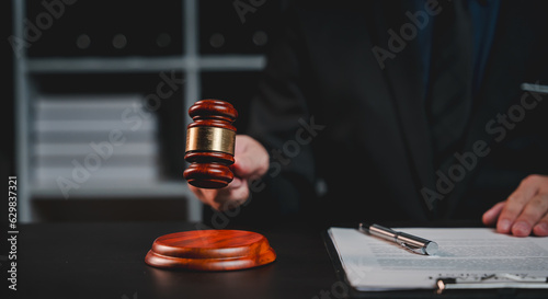Close-up of judge holding hammer and law book on table in lawyer office.legal justice concept