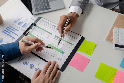 Meeting room atmosphere, business people meeting together on finance topics, they are working together to plan and solve corporate finance issues. Concept of business administration and finance.