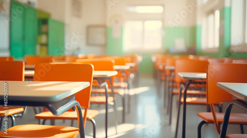 Blurry view of elementary class room no kid or teacher with chairs and tables in campus.Created with Generative AI technology.