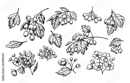 Hawthorn berries and leaves set. Hand drawn herbal plants. Sketch vector illustration.