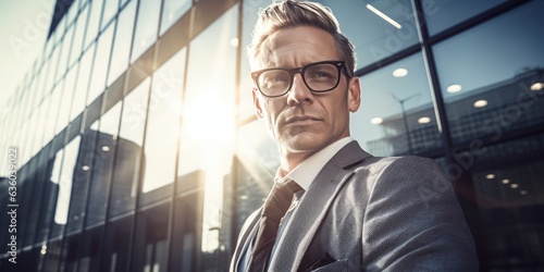#1190479882A suited businessman stands in front of a modern glass building, showcasing professional confidence and corporate success.