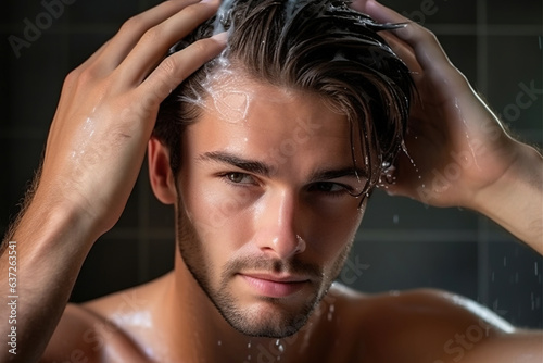 Handsome young man applying shampoo on his hair, preparing for a wash