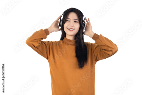 Young Asian woman listening to music with headphones isolated on white background with clipping path. People lifestyle concept.
