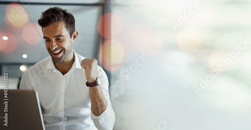 Mockup, laptop or happy man trading with success, goals or sales target in online achievement in office. Proud investor, wow or excited trader in celebration of winning on stock market bonus victory