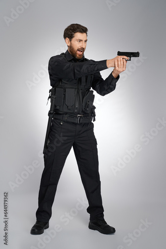 Tensed bearded police officer keeping at gunpoint, while shouting. Front view of excited male cop with handgun working, preventing crime, on gray studio background. Concept of work, equipment.
