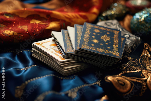 A pile of tarot cards scattered across a table top. Esoteric background. Fortune telling, tarot predictions. Generative AI