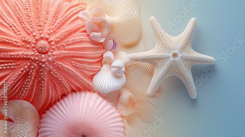 Creative minimal style concept of underwater life. Light pastel colors. Unusual inhabitants of the sea or ocean, macro closeup wallpaper with starfish, copy space.