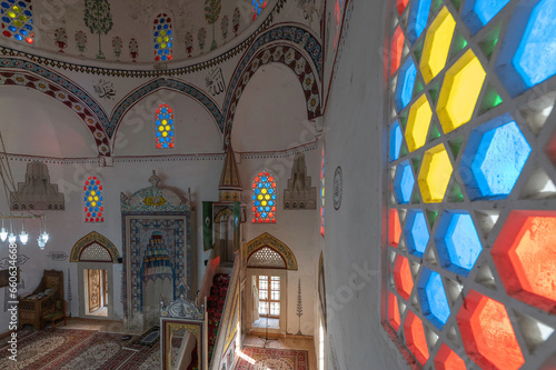 Mostar, Meczet Koski Mehmed Pasha Mosque. Wnętrze meczetu, zdobienia , malowidła, żyrandol, ołtarz witraże, dywany