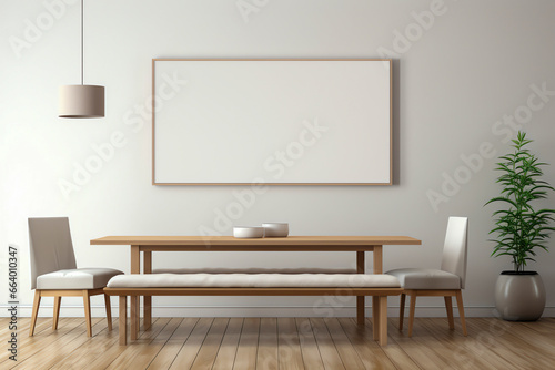 Mixed Wood Table, Cushioned Bench Seating on Herringbone Wood Floor, Mock Up Poster on Panelled Wall. Cozy Modern-Minimalist Dining Room.