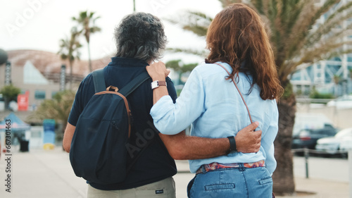 Elderly couple in love happy together, smiling and having conversation, hugging each other, walking together enjoying the day outdoors, back view
