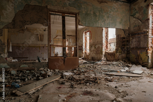 Interior of abandoned spacious room with glass door cabinet and broken damaged brick walls with open windows strewn rubble on unkept floor with furniture in daylight