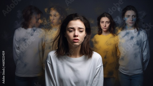 Young woman suffer split emotions into five different inner personalities. Multipolar mental health disorder concept. Schizophrenia psychiatric disease. Face expressions and reactions mood change.