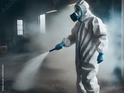 team in protective suit and respiratory mask disinfecting the atmosphere of the zone with radioactivity, environment concept, generative ai
