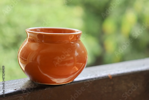 brown ceramic small matka with blurred background