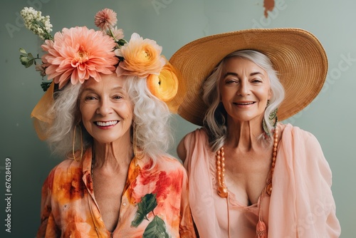 Two Positive elderly lady with incredible hairstyle. A close-up portrait of an elderly woman with a wreath of large bright flowers woven into her gray hair.
