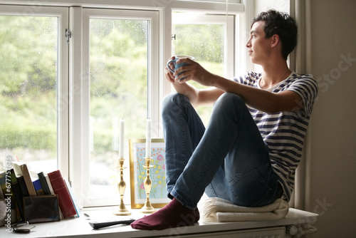 Man, drinking coffee and thinking by window, peace and growth at home, vision and idea for future. Male person, positive mindset and tea by view, relax and calm or inspiration, planning and daydream
